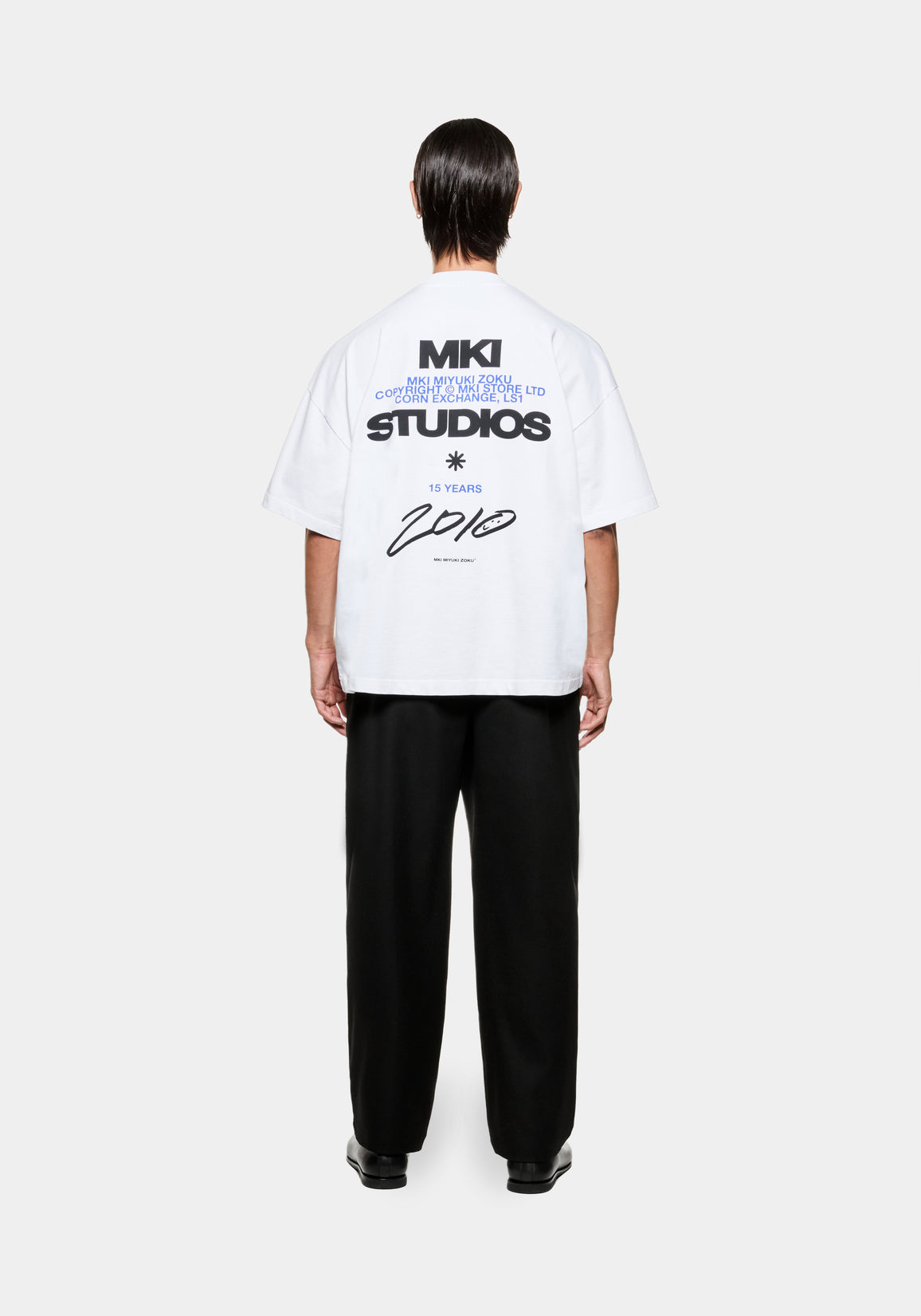 MKI 15 YEARS T-SHIRT IN WHITE. THE MKI 15 YEARS T-SHIRT FEATURES A GRAPHIC PRINT HONOURING 15 YEARS OF INDEPENDENTLY OWNED, GLOBALLY-RENOWNED MENSWEAR. THE HEAVYWEIGHT T-SHIRT IS CRAFTED FROM 300GSM COTTON JERSEY, PRESENTED IN AN OVERSIZED BOX FIT WITH DROPPED SHOULDERS AND A CLOSE-FITTING NECKLINE.