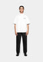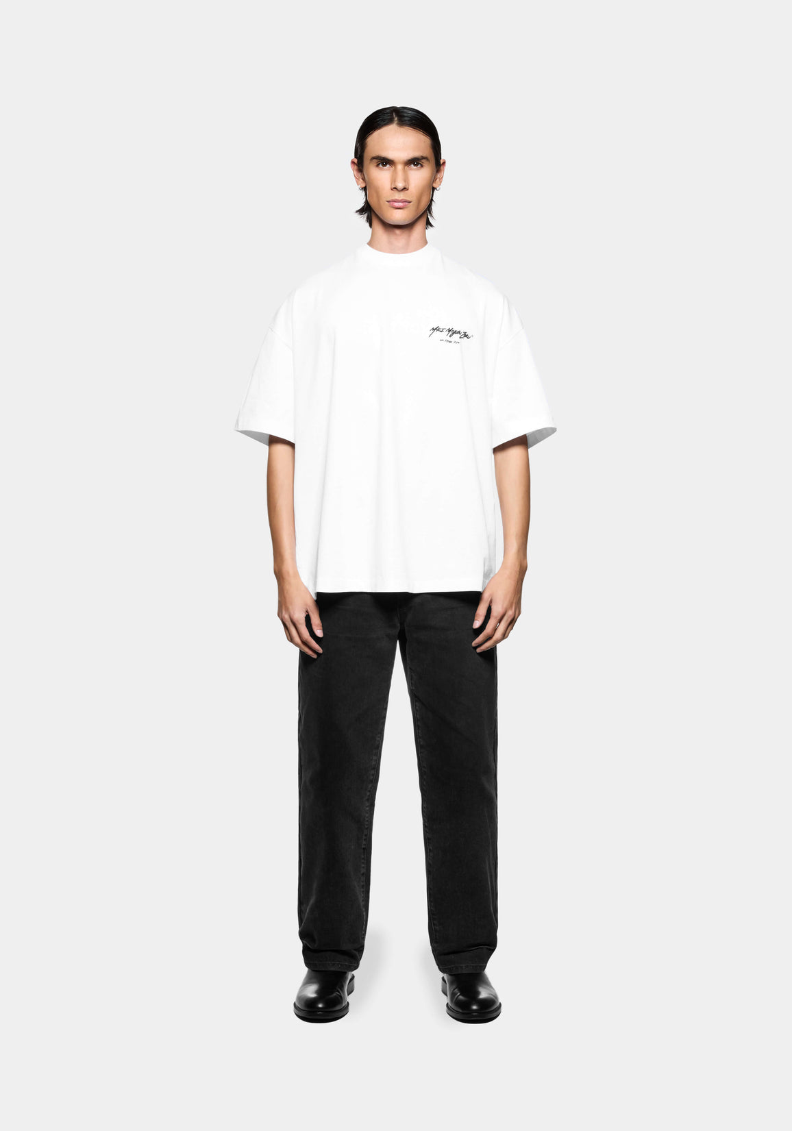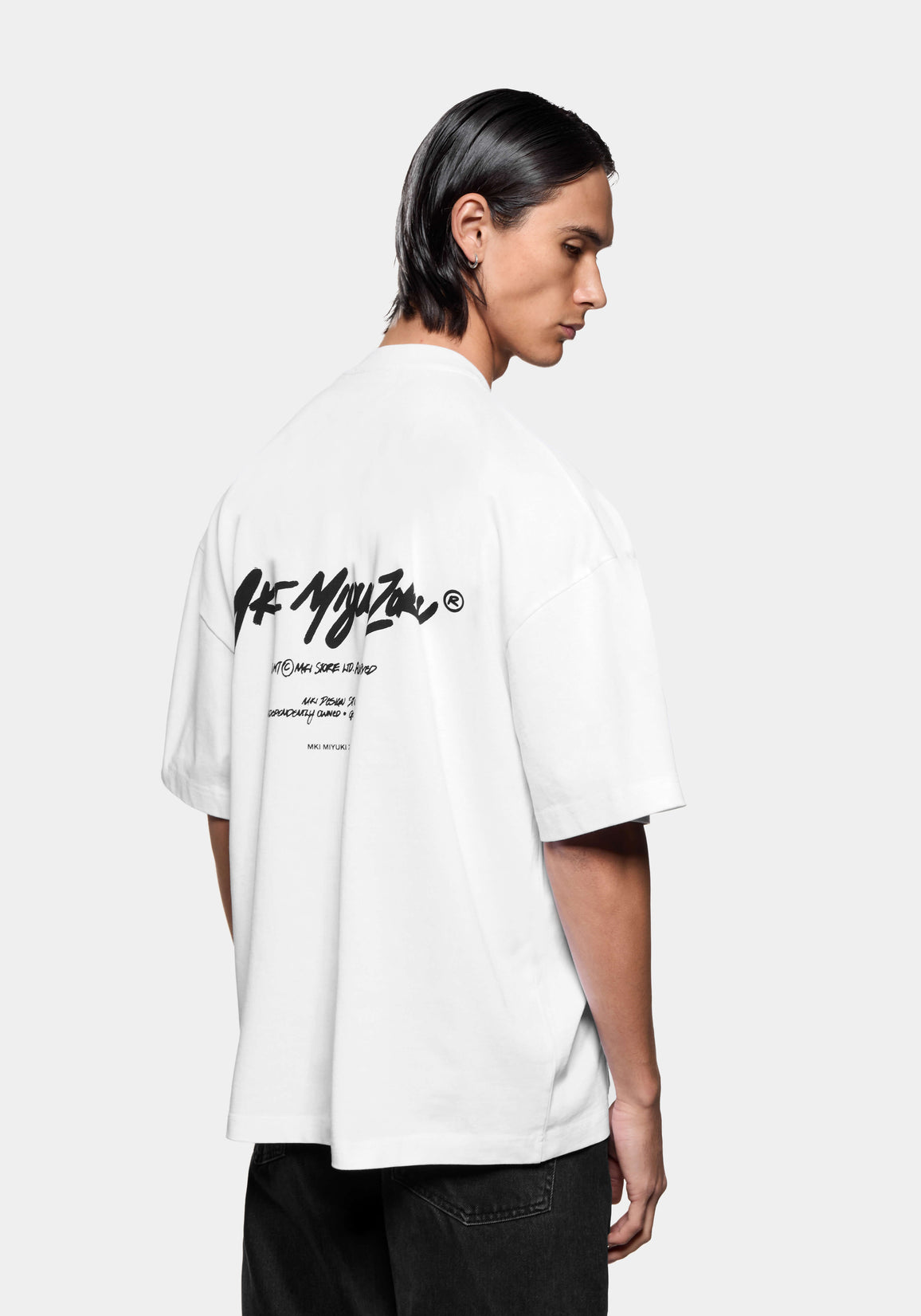 MKI BLACK FRIDAY T SHIRT IN WHITE. THE MKI BLACK FRIDAY T-SHIRT PRESENTS A ONE-OFF INTERPRETATION OF THE ICONIC MKI DESIGN STUDIO BRANDING, SCREEN-PRINTED IN BLACK ONTO A WHITE 300GSM, 100% COTTON JERSEY BASE. CUT TO AN OVERSIZED BOX FIT SILHOUETTE WITH DROPPED SHOULDERS AND A CLOSE-FITTING NECKLINE. THIS HEAVYWEIGHT PIECE FORMS PART OF THE LIMITED EDITION MKI BLACK FRIDAY CAPSULE.