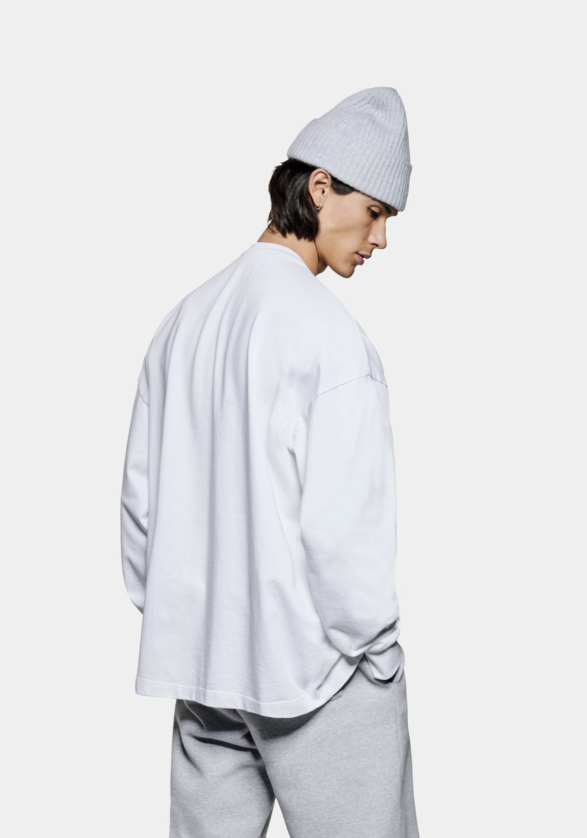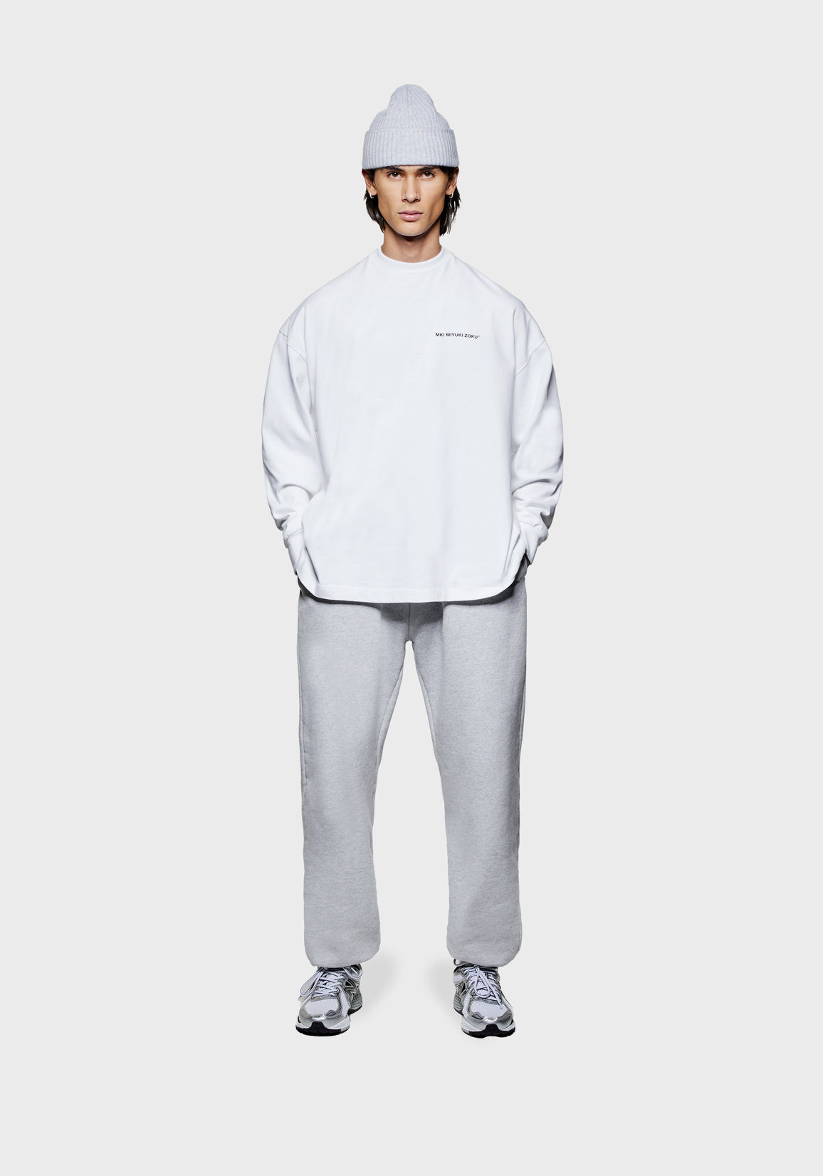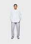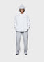 THE MODEL IS 6FT WITH A 38" CHEST AND 31" WAIST AND HAS BEEN STYLED IN A MEDIUM. WE RECOMMEND PURCHASING YOUR REGULAR SIZE, FOR THE DESIRED OVERSIZED FIT. THE MODEL IS ALSO WEARING MKI UNIFORM JOGGERS IN GREY.