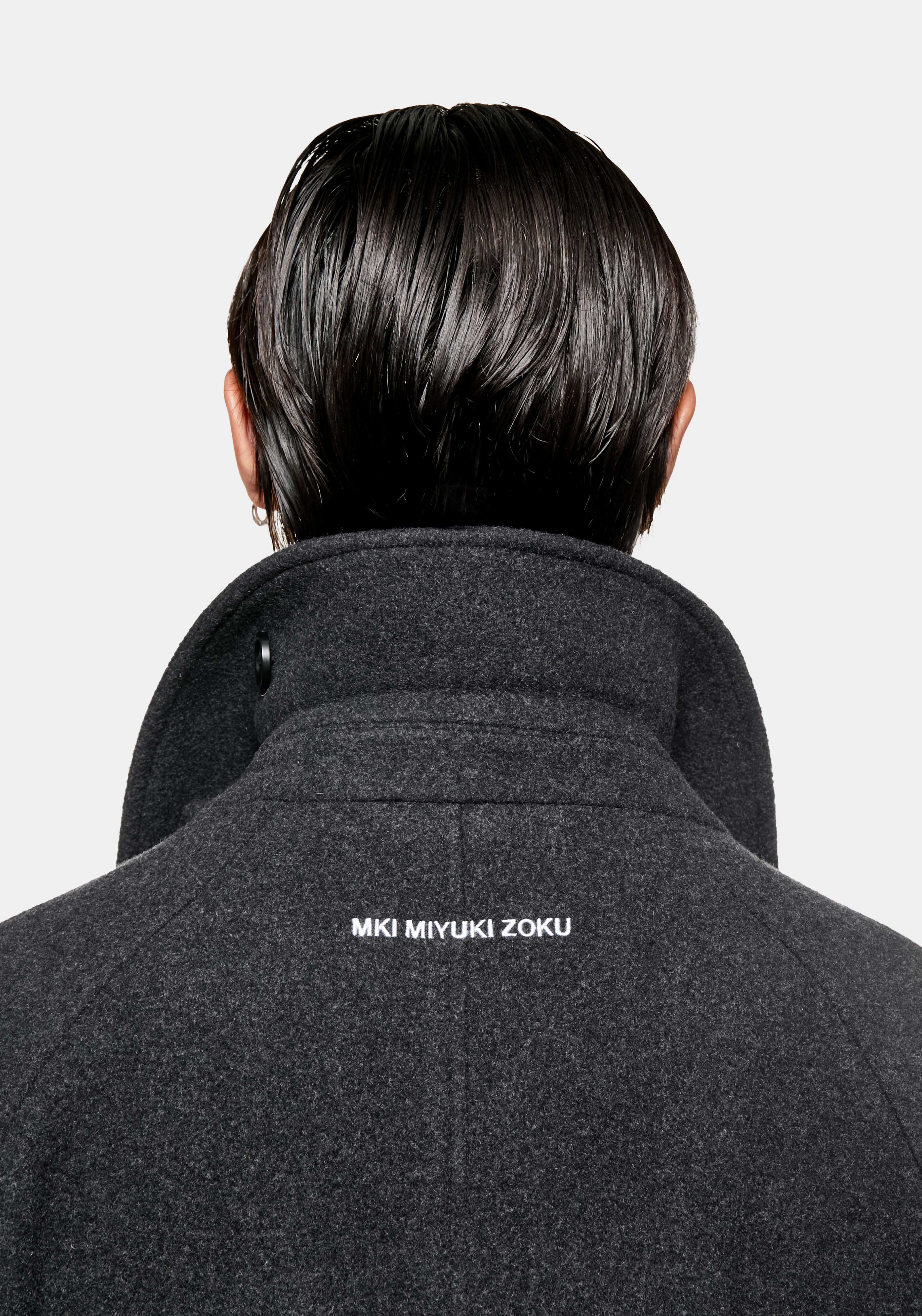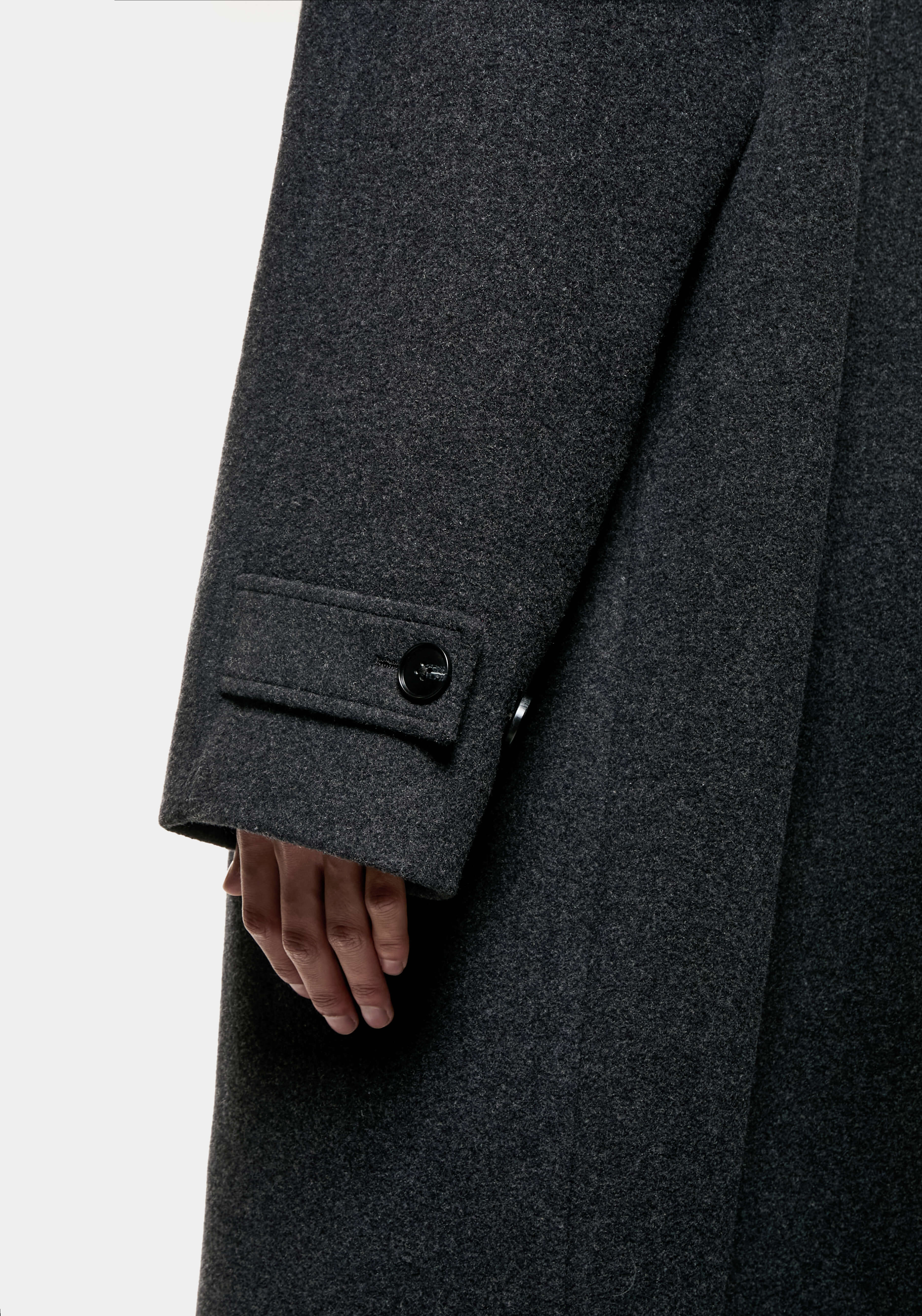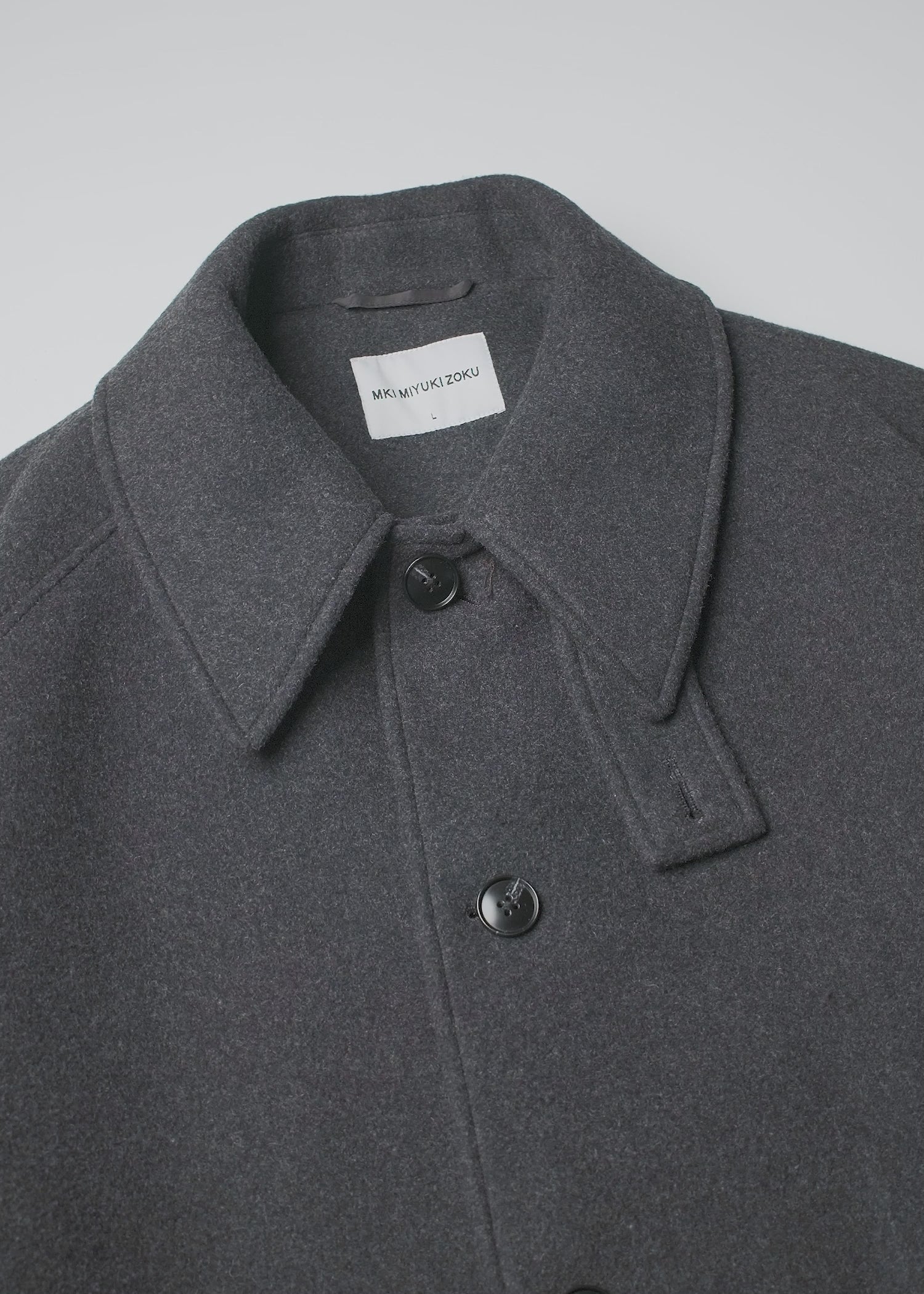 MKI WOOL CAR COAT IN CHARCOAL. THE MKI WOOL CAR COAT WELCOMES BACK A STAPLE PIECE FROM THE MKI FALL/WINTER COLLECTIONS, FEATURING A SINGLE BUTTON PLACKET AND DROPPED RAGLAN SLEEVES. THE STRUCTURED STORM COLLAR WITH BUTTON TAB DRAWS UPON UTILITY AND FUNCTIONALITY, ELEVATING THE CLEAN LINES OF THE SILHOUETTE.