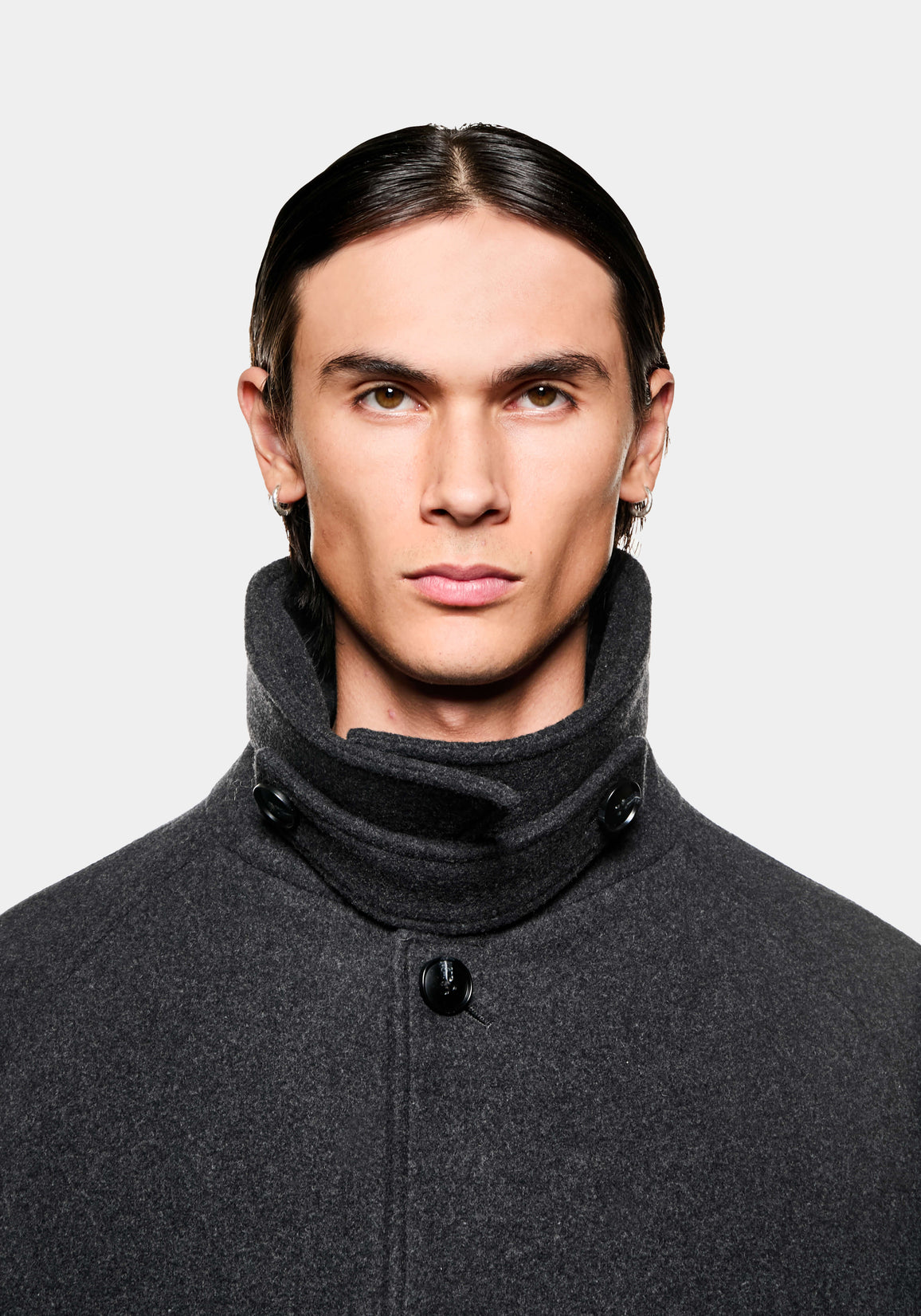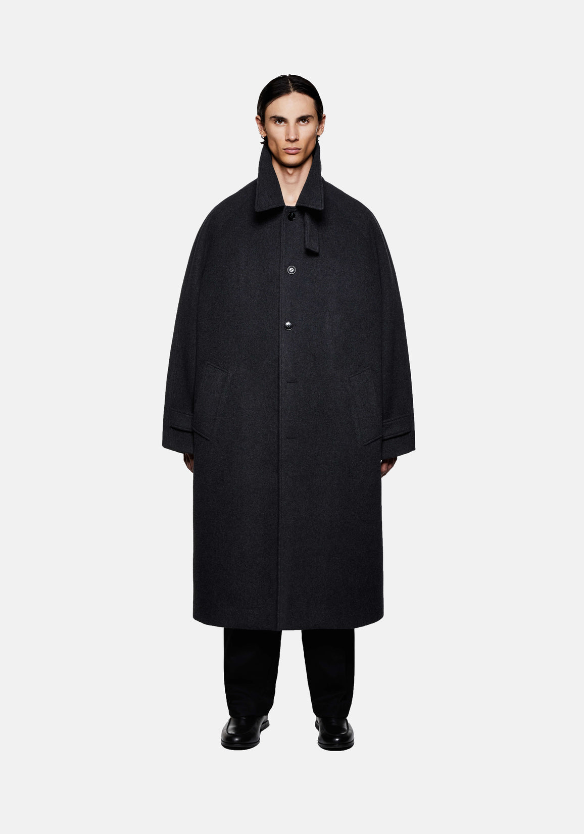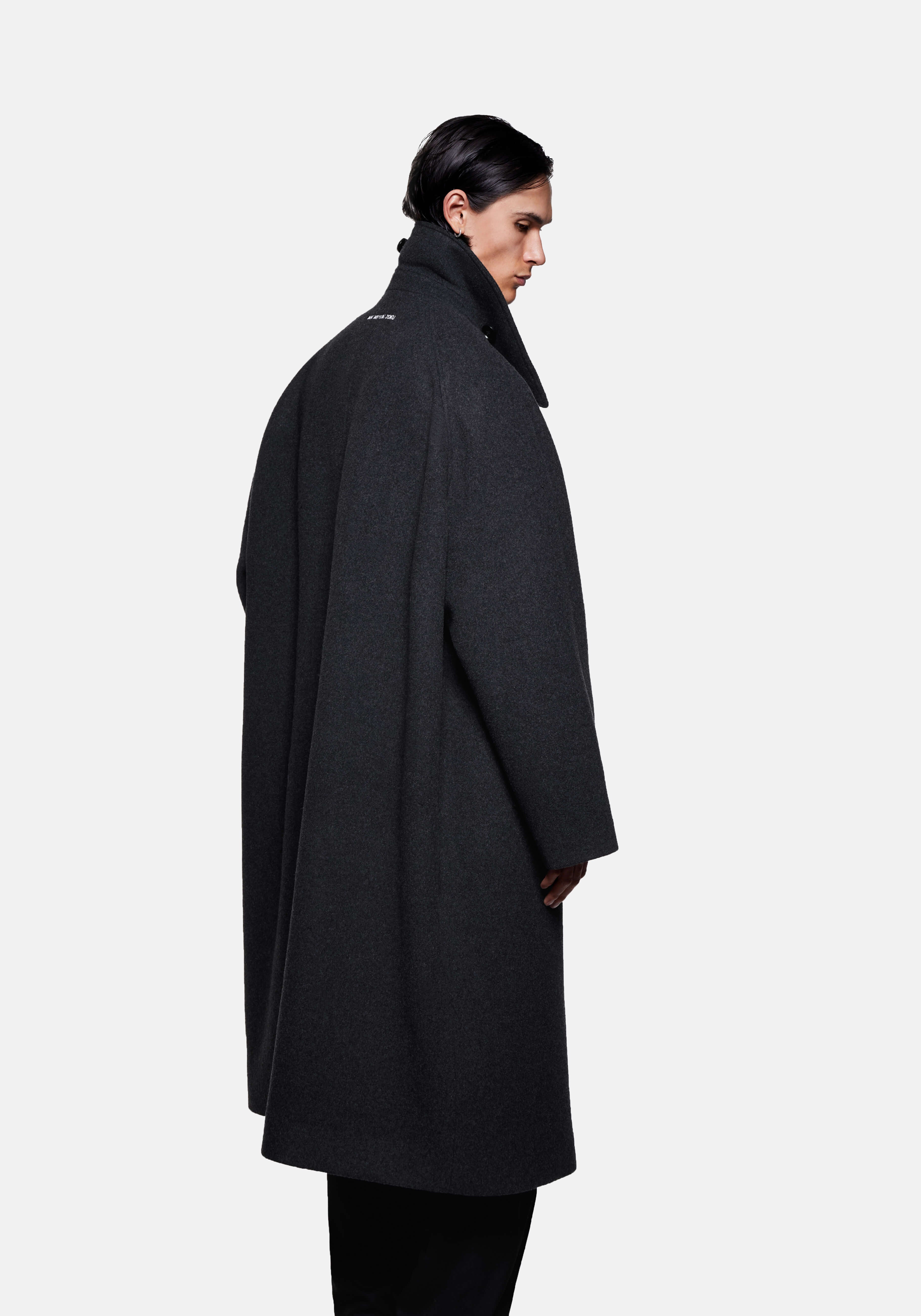 MKI WOOL CAR COAT IN CHARCOAL. THE MKI WOOL CAR COAT WELCOMES BACK A STAPLE PIECE FROM THE MKI FALL/WINTER COLLECTIONS, FEATURING A SINGLE BUTTON PLACKET AND DROPPED RAGLAN SLEEVES. THE STRUCTURED STORM COLLAR WITH BUTTON TAB DRAWS UPON UTILITY AND FUNCTIONALITY, ELEVATING THE CLEAN LINES OF THE SILHOUETTE.
